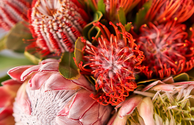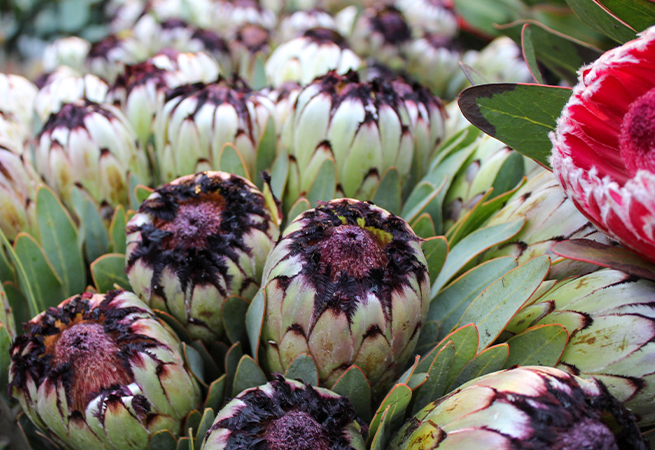 Die Protea-Familie umfasst über 100 Arten und bringt eine beeindruckende Vielfalt hervor – von der majestätischen Königsprotea bis zur filigranen Nadelprotea. Ihre Heimat liegt in den Fynbos-Regionen Südafrikas, wo sie seit Jahrmillionen an Feuerökosysteme angepasst sind. Im europäischen Herbst erscheinen sie als exotische Begleiter: lange haltbar, sowohl frisch als auch getrocknet, und stets von unverwechselbarer Präsenz.